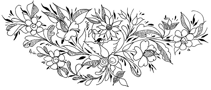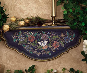 brush. Note: Shadows and highlights are created by placing a dot or short line of the appropriate color, and while it is still wet, pull out thin lines that follow the contour of the petal or leaf. 2. Leaves: Basecoat the light leaves with Hauser Lt. Green and the dark leaves with Viridian Green with a touch of White. Dark linework is Lamp Black. Light linework is White with just a touch of Viridian Green. 3. Purple Flowers and Buds: Basecoat with Royal Purple with a touch of White to make a medium value. Dark linework is Royal Purple. Light linework is the basecoat color plus more White. Place a dot of Royal Purple at the tip of each bud. 4. Blue Flowers: Basecoat with White plus a little Blueberry mixed to a medium value. Dark linework is Blueberry. Light linework is White. 5. Pink Flowers: Base with White and a touch of Alizarin Crimson to make a middle value. Dark linework is Alizarin Crimson. Light linework is White. 6. Bird is based with White. Shadow is Prussian Blue. 7. Re-paint any gold lines that may have been covered with paint. Use the small round and/or the #10/0 script brush and Glorious Gold to paint any remaining fill-in strokes. 8. Dampen the sea sponge with water and remove excess moisture. Dab lightly into Glorious Gold and dab on palette until you have a lacy design. Dab on routed areas around the design area. Fill in the outside routing with a coat of Glorious Gold. 9. Seal shelf with DuraClear Gloss Varnish (always use gloss varnish when you use metallic colors). |
