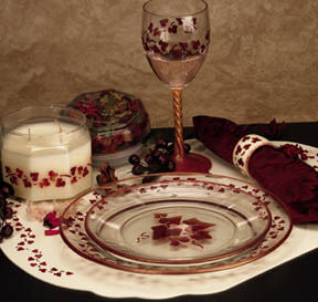 1. Clean all glassware with rubbing alcohol or white vinegar. Dry thoroughly with a soft cloth or paper towels. 2. LARGE PLATE: Position Ivy Medley Border stencil to the underside of the rim. Dip pouncer into Bronze and True Gold. Dab several times on a paper towel until almost dry. Pounce lightly over stencil leaves. Dip another pouncer into Cranberry and dab over the Bronze and True Gold. Let dry. Next, use synthetic sponge to dab all colors simultaneously around edge of plate. It will create a mottled effect. Let dry. 3. SMALL PLATE: Position Ivy Medley stencil to the center of underside of plate. Repeat the process described for the large plate. After it is dry, use pointed tip of pouncer to etch leaf veins. Pounce more Bronze and Gold Pearl over veins. Use synthetic sponge to dab all colors simultaneously around edge of plate. It creates the mottled effect. Let dry. 4. GOBLET: Position Ivy Medley stencil around center of goblet. Use pouncer to apply Cranberry, then the Bronze and Gold leaves. Use soft synthetic sponge to dab all colors simultaneously around base and stem of goblet. Let dry. 5. NAPKIN RING: Position Ivy Medley border stencil around napkin ring. Use pouncer to apply paints in the same manner described for goblet. Sponge colors on edges of ring in the same manner described earlier. 6. CANDLE/POTPOURRI CANISTER: Position Ivy Medley border stencil and paint in the same manner described for goblet and napkin ring. Allow to dry. Remove plastic lid and fill the top with a color coordinated potpourri. 7. PLACEMAT: Position Ivy Medley border stencil on edges of placemat. Use pouncer to apply paints in the same manner as described earlier. Allow to dry. NOTE: When using Ultra Gloss paints, it is important that brushes are clean and dry. There must not be any residue of cleaning solvent in the bristles. Rinse well in clean water. |