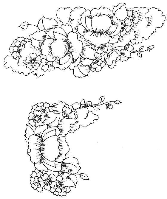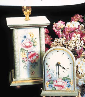 base painting is done. 2. Sponge all pieces with Silver Sage Green and White Cloud. Pat the sponge first in Silver Sage Green and then in White Cloud and apply to all surfaces except the white areas. 3. Do routed edges on base of clock and lamp in Silver Sage Green. Do Heavenly Gold banding on all pieces. 4. Paint all White areas Titanium White. 5. Float around the edge of the clock, down edge of lamp panels and around edge of floral patterns with Hunter Green. 6. Wash yellow flowers in Golden Halo. Float shadows in Honey Brown and highlights in Moon Yellow. Stipple centers with Earth Brown. 7. Stipple lilacs very lightly in Pansy Lavender tipped in White Cloud. Float shadows lightly with Pansy Lavender. 8. Float leaves in Hunter Green. When dry, float the deeper shadows again with Hunter Green. 9. Wash the blue flowers in Country Blue. Float the shadows lightly with Deep Midnight Blue and the highlights with Angel Blue. Stipple centers with Golden Halo. 10. Wash the pink flowers in Misty Mauve. Float the shadows with Beautiful Burgundy and the highlights with White Cloud. Lampshade 1. Do Glorious Gold bands at top and bottom. 2. Mix equal parts Williamsburg Blue and Christmas Green and do tendrils and small stroke leaves. |