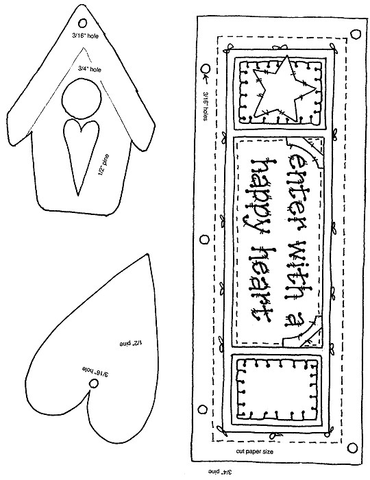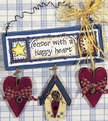 | Preparation After individual pieces of wood have been cut out, sand each piece. No wood sealer is necessary, because we want the grain to show through. Carefully transfer pattern onto an 8 1/2” x 11” piece of watercolor paper. No detail is needed at this time. Cut image to size after it has been painted. Painting Instructions (for paper) You may not be used to painting on watercolor paper instead of wood but it is pretty much the same, only the paint dries faster on paper. It’s nice to use paper because, if you want to make more than one, you can simply copy the design onto the paper with a copy machine. 1. Start with the washes in each section of the picture. Pre-wet the area to be painted. The area around the star is Antique Teal, around the words is Mink Tan, and around the far left section is a darker shade of Mink Tan. Use about 20% paint and 80% water to create washes. If color is not dark enough, add more paint to the water or give it a second coat. 2. Load brush and carefully paint around outside edge and let paint diffuse into the wet area. Be sure to not paint the brackets in the middle section because the white of the paper is the only white needed. 3. Paint the star Golden Straw in the same manner. A lighter area in the middle makes it look like light is hitting it. 4. The red border around the outside is Cranberry Wine mixed with a little Russet. 5. The blue border is painted with Wedgewood Blue. After this has dried, use a #8 Shader (flat brush) to paint the checkerboards with Williamsburg Blue. 6. The last thing needed is to sideload a brush with Payne’s Grey and shade around the white brackets. This will make the brackets seem to pop out. 7. Use the stylus and Cranberry Wine to make the 3-dot pattern around the words. To make the hearts in the far left section, again use the stylus. Place two dots of Russet close together and pull them down to a point to form the heart. 8. Outline complete drawing using the .50 Rapidograph. Add all stitch marks, etc. Use the .70 Rapid-ograph for the lettering. Painting the Wood 3 1/4” x 8 1/2” plaque. One coat of Williamsburg Blue. Hearts: Cranberry Wine. Base birdhouse with Sand. Roof line: Wedgewood Blue. The checkerboard stencil is Williamsburg Blue. Use .50 rapidograph to add stitch marks. Finishing Instructions Lightly sand all wood parts around the edges to get a worn look. Cut the watercolor paper to the correct size and glue it to the wood using the Mod Podge. Use a pen or dowel to curl the 18 gauge wire for the hanger. Tear gingham fabric to make bows and glue onto the hearts. Also glue on buttons. Glue Spanish moss into the 3/4” hole in the birdhouse. tie a raffia bow on the wire hanger and you are done. |