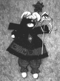 | 2. | Cut 1 piece of ribbed knit 4" x 10" for hat. Fold knit in half RST, sew 10" side. Hand gather one open end. Pull threads tight, knot and clip threads. Turn RSO. Turn bottom edge under 1-1/2" and then turn up 3/4" to cuff. Make small slit (about 1/2") in center front of hat to pull ears through (about 1" from cuffed edge of hat). Pull ears through slit. Spot glue hat to head. Glue 1/2" jingle bell to hat top. Tie threads through holes of small button. Glue to cuff of hat. Crumple ears. |