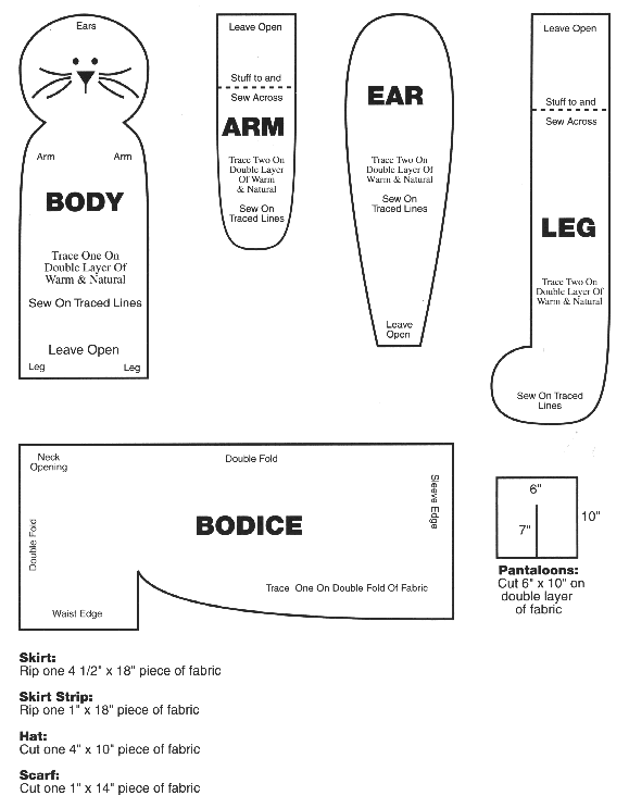 | 1. | Trace 1 body, 2 arms, 2 legs, and 2 ears on double layer of Warm & Natural. Sew on traced lines. Leave open where pattern indicates. Cut out, leaving 1/4" SA. Clip curves. |
