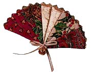Cut 2 wedges from each scrap of holiday fabric. Sew the fabric wedges together to create two fans. Press seams and fuse fleece to wrong side of one of the fan shapes. Baste center of rickrack along seamline on curved edge of fan piece with the fleece. Sew both fan pieces right sides together, leaving a small opening for turning. Clip curves, turn to right side and sew opening closed. Press. Use contrasting thread to machine quilt down the center of each fan wedge. Tie the ribbon into a bow and sew to the bottom point of fan. Sew bell at center of bow. Use a piece of thread to create a hanging loop at center top of fan.