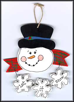PAINTING (all paints are by Delta): 1) Basecoat face and snowflakes White (2505). 2) Paint Hat Black (2506). 3) Basecoat scarf Bright Red (2503). 4) Using Copen Blue (2051) paint ribbon on hat. 5) Using Copen Blue (2051) and Kelly Green (2052) paint scarf to look plaid. 6) Paint leaves on hat ribbon Kelly Green (2052). 7) Dip the end of brush into Bright Red (2503) and make dots for holly berries. 8) To paint the cheeks: Mix a little bit of Bright Red (2503) with Fleshtone (2019) until you get desired cheek colour. Pick up a small amount of paint with the pad of your pinky finger. Press onto snowman face. Repeat for second cheek. (You may want to make a few practice cheeks on a blank piece of paper first). 9) Mix 1 part Bright Red (2503) and 1 part Crocus Yellow (2459). Use this orange colour to paint nose. 10) Dip the end of brush into Black (#2506) and make dots for eyes and "coal" dots for mouth. 11) Dip a toothpick into White (2505) and dot eyes. 12) Varnish if desired. 13) With a waterproof pen, draw the mouth, eyebrows and slash marks in the corner of eyes. Outline the cheeks, nose and holly. Write "Let it Snow" on the snowflakes. Outline the face, scarf and snowflakes. HOW TO: 1) Drill small holes in the snowflakes and scarf for wire. 2) Cut four 3" pieces of 24 gauge wire. Attach the scarf and snowflakes together by inserting the wire through the objects and twisting the ends together. Cut off any extra wire. (Ribbon or string may be used in place of wire). 3) Hot glue the face to the scarf. 4) String 7" of twine or ribbon through Frosty's hat, tie and cut off any extra. |