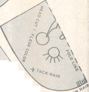 5. Cut twelve 5 - inch strands of bright yellow yarn for hair and attach across top of head. Braiding of hair is optional.