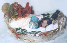 What you need: 1 small willow basket; gold or silver spray paint (optional); 3 miniature toiletries; 1 small perfume; soap; sluffing glove or scrubby;; 1 sheet of wrapping tissue (white or color of choice); 2 sprigs of holly berries with leaves or evergreen attached; 1 gold plastic miniature photo frame; stretch seal or cello wrap; 1 Christmas bow or holiday floral sprig; 1 special photo; glue; 1 Christmas bow or holiday floral sprig.