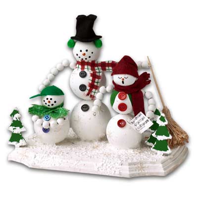 | 3. | To attach lower body sections to base, drill three holes in base, being sure to leave enough space for each figure. Place a dowel into each hole in base. Place lower section ball onto dowel. Attach another dowel into next hole and place middle section atop lower section. Continue until each snowperson’s body is complete. Let dry. |