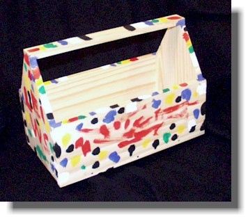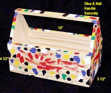 Step 4 - Present your prepared project to your young carpenter and help them understand the construction steps. They should be able to pound the nails in and even spread the glue if you don't mind a little extra glue on the wood. Please glue each joint as you nail it. This is especially important for the handle. NOTE: The length of the bottom will need to be trimmed shorter "to fit the actual bottom opening length" during assembly. This is due to the different thickness of project panels you may purchase. Step 5 - Paint or crayon to make it personally theirs. They will feel pride in their accomplishment, and so will you.