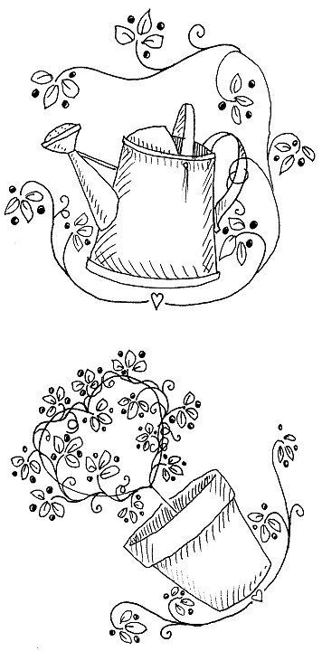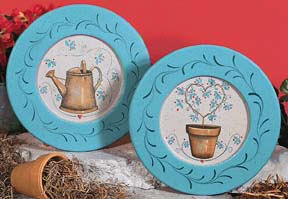 area of plates. 2. Spatter with Graphite, Black Green, Golden Straw and Milk Chocolate. 3. Use 10/0 Liner to add tiny flecks of Golden Straw and Graphite. 4. Apply Green Mist to rims. Spatter lightly with Antique Teal and Black Green. 5. Apply patterns. 6. Add stroke work around rims using Antique Teal and 10/0 Liner. 7. Apply a wash of Milk Chocolate to terra cotta pot on topiary plate. 8. Cornerload shader brush with Black Green to shade pot. Slightly thin some Golden Straw and apply a stroke down middle of pot and rim to highlight, using the round brush. 9. Spatter center of pot with Green Mist to give it a “patina.” Further highlight with tiny strokes of Golden Straw and Eggshell. 10. Shade inside of pot with a wash of Black Green. 11. Add main heart-shaped topiary structure with slightly thinned Milk chocolate. Shade with a few strokes of Graphite. Highlight stem Golden Straw. Outline pot with Black Green. 12. On watering can plate, apply a wash of Milk Chocolate to watering can. Shade with cornerloaded Black Green. 13. Apply a thin wash of Graphite to inner part of handles and a wash of Black Green to inside of can. Highlight center with a thin stroke of Golden Straw, using the round brush. 14. Further highlight watering can, referring to photo, with strokes of Golden Straw and Eggshell. 15. Spatter center of watering can with Green Mist and Eggshell to give it a “patina.” Outline watering can with Black Green. 16. Add vines, tendrils with Antique Teal. Leaves are Green Mist outlined with Antique Teal. Add berries and hearts with slightly thinned Napa Red. 17. Highlight berries with tiny dots of Eggshell. Add a stroke of Golden Straw to hearts. 18. Spray with Matt Sealer. |