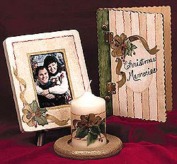 Heavenly Hues are transparent color washes that allow one-step decorating for wood, ceramic bisque, or plaster. Simply apply paint and then wipe off excess. When used as a wash over opaque Americana acrylics, the result is added depth or an antique finish. Transferring Pattern Lay tracing paper over pattern and draw the basic lines. Lay this tracing on the surface to be painted. tape to secure. Slip graphite paper between the tracing and the surface. Trace with a pencil to transfer the design. Do not trace details until after basecoating has dried. Painting Instructions 1. Use old fan brush to paint circle tray with Pale Gold. Set aside to dry. 2. Paint frame and memory book with Cloud White. Wipe back. Let dry. 3. Trace oval onto piece of poster board or cardboard and cut out. Center oval on album. Tape strips of masking tape on album (securing oval) to make vertical stripes. Tape 1/2" outside border of frame and 1/2" borders at top and bottom of candle. 4. Lightly mist candle with matte spray. Set aside to dry. 5. Sponge Beautiful Beige on exposed areas of book, frame and candle. Let dry. Remove tape. 6. Transfer patterns. Use flat brush to paint holly leaves and album border Hunter Green, berries Beautiful Burgundy and ribbon Heavenly Gold. 7. Use flat brush to shade ribbon with Soft Black. Use liner and Soft Black to paint berry stems and "Christmas Memories." 8. Use liner to make Beautiful Burgundy squiggle lines to accent borders between White Cloud and Blissful Beige areas. 9. Use flat brush to paint 1/4" border of Heavenly Gold on inside edge of frame. Let dry. 10. Mist all with two light coats of Matte Spray, allowing to dry between coats. Helpful hint: Do not over stroke Heavenly Hues on candle. A light coat of Matte Spray between coats will help if you need to shade, highlight or touch up. |