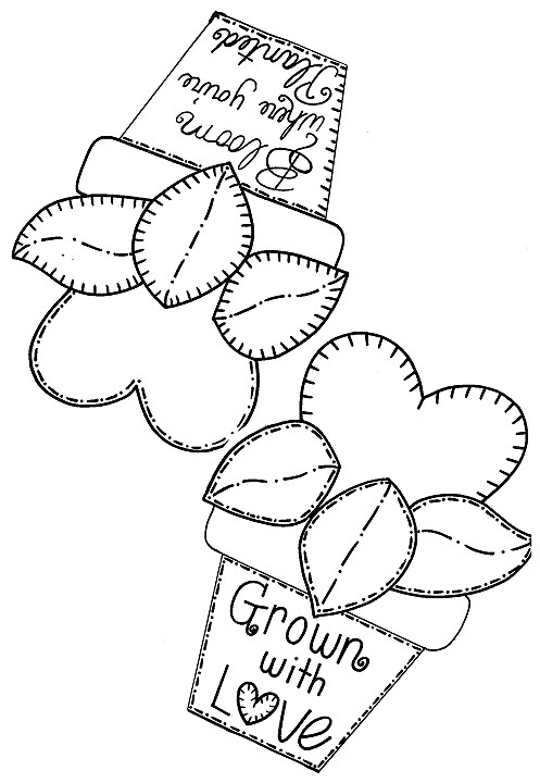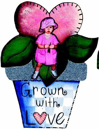 designs. PAINTING INSTRUCTIONS GROWN WITH LOVE POT 1. With 3/4" flat shader, basecoat leaves with Hunter Green. Shade with #12 shader and Dark Hauser Green. Use 3/4" flat shader to highlight with drybrush strokes of Thermal Green. 2. Basecoat the heart with Misty Mauve. Use deerfoot brush to stipple with Orchid and Snow White. With #12 brush, shade with Black Plum and drybrush highlights with Sizzling Pink. Use 3/4" flat shader to highlight right side with Titanium White. 3. Use #12 flat shader to paint checks on the pot in Country Blue. Shade with Prussian Blue. 4. Use 3/4" flat shader to paint rim of the pot Blue Shale. 5. Spatter with Ebony Black using fan brush or old toothbrush. 6. Lettering and detailing are done with a permanent black ink pen. Glue on desired photograph. BLOOM WHERE YOU'RE PLANTED POT 1. With 3/4" flat shader, basecoat leaves with Hunter Green. Use #12 brush to shade with Dark Hauser Green and highlight with drybrush strokes of Thermal Green. 2. Paint checks on heart using #12 brush with Golden Halo and Country Blue. Shade blue checks with Prussian Blue. 3. Use 3/4" flat shader to paint rim of pot Blue Shale. 4. Also use 3/4" brush to basecoat the pot with Shadow Tan. Use deerfoot brush to stipple with Earth Brown, Golden Halo and Copper. Shade with Burnt Sienna. 5. Spatter with Ebony Black, using fan brush or old toothbrush. 6. Lettering and detailing is done with permanent black ink pen. Glue on desired photograph. |