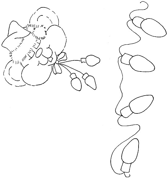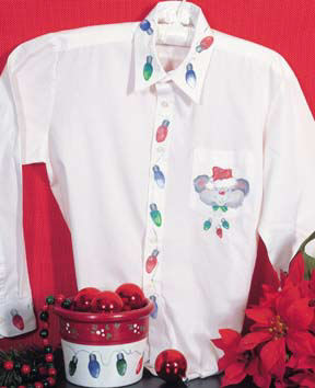 pattern Painting Instructions 1. Base red bulbs with christmas Red So-Soft Metallics, shade with Burgundy. Base the blue bulbs with Lt. Blue, shade with Bright Blue. Base the green bulbs with Leaf Green, shade with Christmas Green. 2. Base bulb sockets with White So-Softs, then sideload shade at the sides with Gunmetal Black. Lightly paint in the cord with Gunmetal Black. Add a White highlight to each bulb. 3. Base the mouse face and ears with Grey Sky. Working wet on wet, load your brush into Grey, then sideload into the Black. Shade around the face and ears. Mix a little Red into the White and blush his cheeks and ears. Base his nose Red. Add a White highlight. Base the tooth White. 4. Base the hat Red and shade with Burgundy. Base the fur White and shade with Light Blue. Base the bow tie with Leaf Green and shade with Christmas Green. Add a White highlight. Refer to step #1 for the bulbs. Finishing Instructions Allow shirt to dry for 24 hours, then draw in the mouse face and around the hat with the pen. Add the short lines around the fur. Holiday Pot Preparation-Base the pot with Gesso. Let dry. Painting Instructions 1. Base the top of the pot with 2 coats of Burgundy, drying one hour between coats. 2. base the bottom of the pot with White. Allow to dry. 3. Apply the pattern, refer to page 45. Place the bulbs randomly and don’t trace on the cord. If you are using a larger or smaller pot, just add or subtract bulbs. 4. Base the bulb sockets with Neutral Grey. Shade edges with Black. 5. With the liner, lightly paint in the cord with Grey, freehand. 6. Add a White highlight to each bulb and the center of each bulb socket. 7. Spatter the bottom section of the pot with Burgundy. 8. With the handle end of a large brush, dot berries randomly around the top section, using a fresh puddle of paint. Let dry very well! Add small red dots on each berry with the stylus. 9. Mix Avocado and White, one to one, for the leaves. They are done by using the #0 Round Brush, using a pressure and release method. Make them different sizes and scatter randomly. Let dry completely. 10. No varnish is necessary. Fill pot with greenery for a lovely holiday accent. |