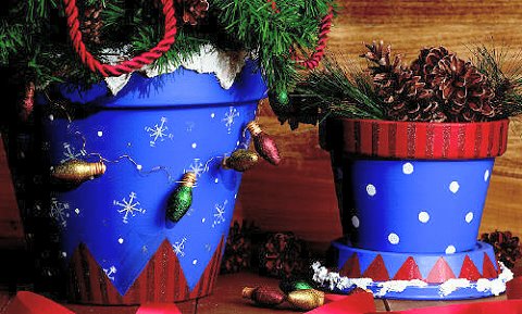 | PREPARATION Trace triangle patterns on cardboard and cut out with scissors. PAINTING INSTRUCTIONS Note: If using pots to hold plants, basecoat entire pot, inside and out. 1. Use 1" flat brush to basecoat large pot, medium pot base and saucer Hydrangea Blue; and rim of medium pot Holly Berry Red. 2. Paint bulb bases Pot O’ Gold and remainder of bulbs with Outdoor Glitters. Set aside to dry. 3. Trace around triangle cut-outs with chalk on large pot base and saucer. 4. Use #10 flat brush to paint triangles Holly Berry Red. Let dry. 5. Use #8 flat brush to stripe triangles on large pot base and medium pot rim with Burgundy Rose. When dry, apply Tinsel Red on stripes. 6. Either trace or freehand snowflakes randomly on large pot. Use liner to paint Cloud White. Use brush handle end to dot white in open areas. Let dry. 7. Use pouncer to apply white dots on medium pot and Starshine on large pot. 8. Use palette knife or craft stick to apply Outdoor Snow on large pot and saucer. Let dry. 9. Wrap wire around bulb bases forming a string of "lights." Hang or attach to large pot rim. |