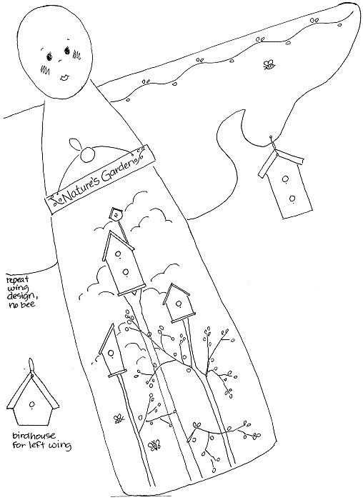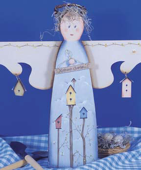 | PREPARATION Sand all wood; wipe clean. Apply Heavenly Hues Blissful Beige to the wings. Mix Heavenly Hues Country Blue and White Cloud in equal parts for a soft blue color. Apply this mixture to the angel body/head. Let dry, then sand lightly with a paper bag. Transfer pattern PAINTING INSTRUCTIONS 1. Basecoat face with Flesh Tone, shade on outer edges with French Mocha. Eyes are based with Lamp (Ebony) Black, with a highlight float of Light French Blue along the left side, then a float of Titanium (Snow) White along the bottom edge. Using the stylus, double dot top and single dot bottom with Titanium (Snow) White. Nose is made by floating French Mocha above the nose mark. Lips are based with French Mocha Shade the top lip with Brandy Wine and highlight the lower lip with Flesh Tone. Eyebrows are Mink Tan. For cheeks, dampen area, then lightly pounce into it with French Mocha. 2. Birdhouses on body from left to right: Birdhouse #1 - Base with French Mocha, shade under roof and up bottom sides with Brandy Wine. Birdhouse #2 - Base with Camel, shade under roof and up bottom sides with Burnt Umber. Small house is based with Mink Tan; shade under roof with Burnt Umber. Pole connecting small house to large house is Mink Tan. Pull Burnt Umber as shade under house. Birdhouse #3 - Base with Light French Blue, shade under roof and up bottom sides with Uniform Blue. On All Birdhouses: Roofs and holes are based with Lamp (Ebony) Black and highlighted with Titanium (Snow) White. Perches are stylus dots of Lamp (Ebony) Black. 3. Branches under Birdhouses: Base with Mississippi Mud, drybrush on Mink Tan, shade with Burnt Umber. Pull the branches out with Mississippi Mud on the tip of the Liner. Here and there, pull lines of Burnt Umber for a variation in the branches. Leaves are done with Antique Green and Dried Basil Green and the #6 Filbert Brush. 4. Bees: Body is based with Camel, stripes are Burnt Umber. Float titanium White for the wings. Shade under bees with Uniform Blue on dress area and Burnt Umber on wing area. 5. On Wings: Branches are Mississippi Mud with Burnt Umber pulled here and there. Leaves are done with the #6 Filbert using Antique Green and Dried Basil Green. Don’t put too many leaves on this section, since it might distract from the focal point of the dress. Shade the edges next to the angel’s body and the bottom edges with Burnt Umber. 6. Hanging birdhouses on wings: Basecoat left one with Dried Basil Green, shade with burnt Umber under roof and up bottom sides. Basecoat right one with Flesh Tone, shade with French Mocha under roof and up bottom sides. Both roofs are based with Lamp (Ebony) Black and highlighted with Titanium (Snow) White. Perches are stylus dots of Lamp (Ebony) Black. 7. Hand is based with Flesh tone and shaded with French Mocha. Sign is based with Mink Tan. Writing is Lamp Black with stylus dots on the ends of each letter. Branches are Burnt Umber with Antique Green leaves. 8. Clouds are done as floats of Titanium (Snow) White. Shade behind them with Uniform Blue here and there, just to deepen the effect. On dress, shade under head on corners, bottom and up bottom edges with Uniform Blue. 9. On all pieces, sides are done with Burnt Umber. Sign piece, then varnish with Matte Varnish. FINISHING INSTRUCTIONS Drill wings and each hanging birdhouse for the thickness of wire you are using. (I doubled up the wire, then twisted it for a heavier look.) Glue on hand, then position sign, making sure it doesn’t cover tallest birdhouse. Glue Spanish moss on head for hair, then attach a grapevine wreath as the halo. If you want to hang her, attach a hanger to the back before attaching hand. |