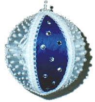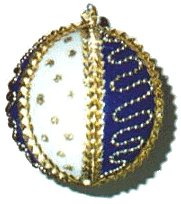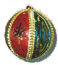 These ornaments are made with Styrofoam balls. Divide the Styrofoam ball into six sections by using string. Draw the pattern onto paper and cut it out. Then draw the pattern three times on two different colors of felt. Cut the pieces out and attach to the ball using straight pins and glue. Straight pin and glue trim to hide where the colors come together. Use sequins or beads to decorate each section.