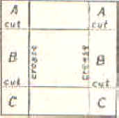 2. For a handle, cut two 5-inch by 1/2-inch strips of the same material—or contrasting material if you like—also with pinking shears. Lay one strip on top of the other and stitch through the center on the machine. Lay one end of the handle over B. Lap A and C over B on the inside. This holds the handle in between. Fasten with a few quick basting stitches. Finish other side the same way.