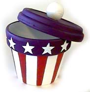 Apply strips of masking tape evenly spaced vertically from rim to base of pot. Paint stripes with two coats of red paint. Allow to dry and carefully remove tape.