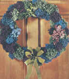 Materials: Six 70 yd skeins heavy rug yarn, 2 blue, 2 green, 2 purple (or colors desired); 22" Styrofoam ring covered with green plastic; 66 fern pins; 3 bunches plastic grapes, 1 blue, 1 green, 1 purple; 2 yds. of 1 3/8" green, water-repellent, velvet-type ribbon; Eight 12" lengths #28 wire; 3" x 4" heavy cardboard.