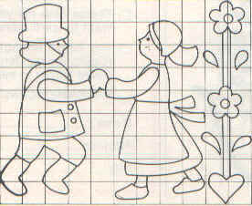 Enlarge appliqué pattern for tea cozy by copying on paper ruled in 1" squares. (1 square = 1")Flower and heart motif is used on both right and left side of pattern. Following ilustration, and using pattern, cut appliqué pieces from scraps of fabric. With embroidery floss, make French knots for woman’s cheek, indicated by dots on pattern. Arrange appliqué pieces on one olive green piece for front, with lower ends of hearts 1" above bottom edge of fabric. Secure appliqués to front piece with fusing web, following package directions. With matching thread, and close zigzag stitch on sewing machine, stitch around each appliqué piece.