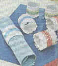 What you need: 4" wide plaster bandage; 2" diameter glass jar; lace, braid or other trim; white spray paint.