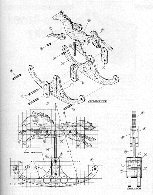 2. Transfer the pattern and cut the parts to shape. Draw a grid with 1/2-in. squares. Enlarge the individual parts of the drawing onto it to make five different patterns. Transfer the enlargements to the wood and cut out all the parts. Drill the holes for the dowel pins and the two decorative holes in each rocker. Sand thoroughly.
