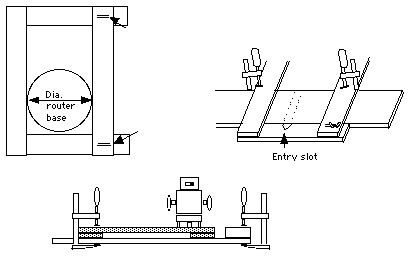 To cut the entry slot in the front board, clamp guide to a piece of plywood, clamp a piece of 2X4 leaving a space of 1 1/2" between it and the front of the guide. With the movable guide strip in the outermost position and using the largest bit that will be used for dado cutting, place the router ahead of the front strip and rout a slot pulling the router back to the 2X4 and side ways to both side guides.
