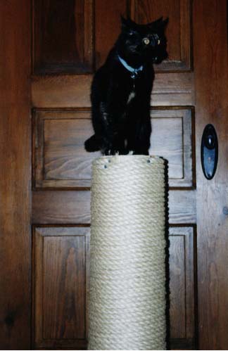 The requirement for this type of scratching post has come from our "cat testers." The reasoning behind this cat post is simple. A post should be as high as your cat is tall when he is fully stretched out plus a few inches. The post should also be wide enough that your cat can sit atop and survey his surroundings. The base should be sturdy enough that the post will not tip over. Once a post tips over on a cat it is very hard to convince a cat to use the post again. The post should be wrapped with sisal rope because cats like something to dig their nails into.