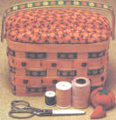 Materials: 1 Basket (with slats, lid and handle); acrylic paint (color of choice); paintbrush; medium weight sandpaper; 5/8" ribbon trim (design and colors of choice); 1 5/8 yards of one color and 3 yards of contrasting color. 1/4 yard calico print to match trims. 1/2 lb polyester stuffing. White glue. Blunt kitchen knife or screwdriver.
