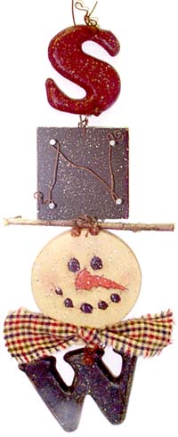HOW TO: 1) Americana Rookwood Red: Basecoat "S". 2) Ceramcoat Chocolate Cherry: Basecoat Square. 3) Americana Desert Sand: Basecoat Circle. 4) Americana Black Green: Basecoat "W". 5) For a primitive look lightly sand the edges of all pieces. 6) Ceramcoat Black: Paint coal for the snowman's eyes and mouth. 7) Burnt Orange: Paint the snowman's nose. 8) Antique all pieces with a mixture of water and DecoArt Walnut Gel Stain. 9) Apply a matte varnish to all pieces. 10) Powder blush: apply to cheeks with a Q-Tip. 11) Fine Pigma Pen: Outline eyes, nose and mouth. 12) Hammer steel nails into each corner of the square. Twist 22 gauge rusty wire around nails to form the letter "N". 13) Drill small holes in the top and bottom of the square and letter "S". Drill small holes in the top of the circle and letter "W". 14) Attach all pieces together by inserting 22 gauge wire through the objects and twisting the ends together. The twig (approximately 4") is attached between the square and circle with wire. Cut off any extra wire. 15) Attach tiny Rusty Jingle Bells if desired. 16) Americana Desert Sand: Using a toothbrush spatter letter "S", square and letter "W". 17) Ceramcoat White: Using a toothbrush spatter circle. 18) Ceramcoat Black: Using a toothbrush lightly spatter all pieces. 19) With a scrap of fabric make a bow and attach to the bottom of circle with hot glue. |