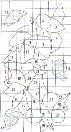 For each side of wreath, cut out pieces as follows: From dark green antique glass, cut pattern pieces 5, 6, 7, 9, 11, 13, 14, 15; from deep red-orange antique glass, cut pattern pieces 19, 20, 23, 24, 25, 26, 27, 28; from emerald green antique glass, cut pattern pieces 1, 4, 21, 22, 30, 32, 34, 36; from orange antique glass, cut pattern pieces 3, 33; from green-blue opalescent glass, cut pattern pieces 2, 31, 35; from apple green opalescent glass, cut pattern pieces 16, 18; from tortoise (dark amber) cathedral glass, cut pattern pieces 8, 10, 12, 17; from amber semi-opalescent glass, cut pattern pieces 29, 37.