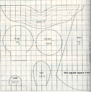 Instructions: Using pink fabric and pattern below, cut 2 head pieces and 4 hand pieces. With blue fabric cut 2 body pieces, 2 large pockets, 2 small pockets and 4 arms. Cut 2 wings from the white fabric and one tooth in white felt.