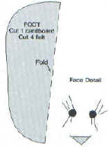 Trace foot pattern, above, and cut from felt and cardboard; glue felt to both sides of cardboard. Glue bottom of leg to back edge of each foot. Attach the basket of flowers to the end of one arm.