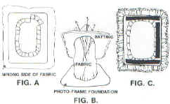 Step 12. When the glue is dry, turn photo-frame foundation right side up. Lift the fabric and push it through the hole in the batting. (Fig. B. below.) Smooth the front fabric over the batting.