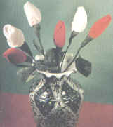 Materials: Velvet or velveteen fabric scraps in colors of choice (red, yellow, white, etc.); Needle and thread to match fabric; cotton balls for stuffing; florists stem wire and florists tape (green) small packages of artificial leaves.