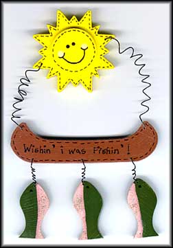 HOW TO: 1) Follow painting instructions below 2) With the waterproof pen, draw the 'stitch lines' and mouth on the sun. Write the words "Wishin' I was Fishin'!" on the canoe. 3) Drill small holes in the canoe and sun for wire. 4) Cut two 5" pieces of wire and wrap around your pen to curl. These pieces attach to the sun and the canoe. 5) Cut three 2" pieces of wire and wrap around the toothpick. These pieces attach the fish to the canoe. 6) Hot glue the metal hanger onto the back of the sun. (you can also make your own 'hanger' with a loop of wire and hot glue. 7) Admire your handiwork! PAINTING (all paints are by Delta): 1) Paint canoe with Spice Brown (#2063). 2) Paint sun rays and sun circle Bright Yellow (#2027). 3) Paint the bottom third of the fish with Rose Cloud (#2450) and the top 2/3 with English Yew Green (#2095). Lightly fleck the Rose Cloud fish bellies with the English Yew Green. Float Bouquet Pink (#2132) along the Rose Cloud to give the fish dimension. 4) Dip the end of your brush or toothpick into Black (#2506) and make dots for the sun and fish eyes. 5) Using a dry brush lightly pounce Rose Cloud (#2450) onto the sun's cheeks. 6) Finish with varnish |