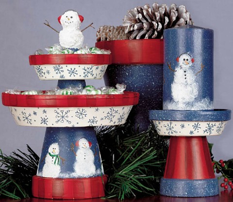 | PREPARATION Clean candle with rubbing alcohol. PAINTING INSTRUCTIONS Candle Note: Mix paint 1:1 with Candle Painting Medium. 1. Basecoat bottom 1" with Holly Berry Red and remainder with Deep Waterfall Blue. Let dry. 2. Load toothbrush with thinned Daisy Cream; spatter blue area. 3. Load small piece of cellulose sponge with Daisy Cream and lightly pounce snowman shape and snow. (Refer to photo for placement.) 4. Use #2 liner for the following details: scarf – Mistletoe Green; earmuffs – Holly Berry Red; arms – 1:1 mix of Holly Berry Red and Mistletoe Green; carrot nose – 1:1 mix of Holly Berry Red and Fiesta Yellow; smile, eyes and buttons –Wrought Iron Black. 5. Add vertical stripes 3/4" apart with Burgundy Rose on Holly Berry Red. Candle Holder 1. Basecoat rims of a 4" saucer and 3" pot Deep Waterfall Blue; when dry, load toothbrush with thinned Daisy Cream and spatter lightly. 2. Basecoat bottom of saucer Daisy Cream; when dry, paint snowflakes with #2 liner and Light Waterfall Blue. 3. Basecoat bottom of 3" pot with Holly Berry Red; when dry, paint Burgundy Rose horizontal stripes with 3/4" flat brush. 4. Glue pieces together, bottom to bottom. 6" Pot 1. Basecoat bottom with Deep Waterfall Blue; when dry, load toothbrush with thinned Daisy Cream and spatter lightly. 2. Basecoat rim with Holly Berry Red and add Burgundy Rose stripes with 3/4" flat brush. Candy Dish 1. Basecoat bottoms of 8" and 4" saucers Daisy Cream. When dry, paint snowflakes with Light Waterfall Blue, using #2 liner. 2. Basecoat rims and inside saucers with Holly Berry Red. When dry, paint Burgundy Rose stripes on rim with 3/4" flat brush. 3. Paint 1", 2" and 4" pots, following steps 1 and 2 for 6" pot. 4. Paint 4" pot, following steps 3 and 4 for candle. (Refer to photo.) 5. Glue bottom to bottom 4" pot to 8" saucer and 4" saucer saucer to 2" pot. Glue small set inside 8" saucer and 1" pot rim side down into 4" saucer. (Refer to photo.) 6. Glue two 1" wooden beads together and cover with Snow-Tex. Shape two small beads of Snow-Tex for earmuffs; apply while wet. When dry, paint Holly Berry Red. Glue small twigs in place for arms. Cut end of toothpick 3/8" long and paint with 1:1 mix of Fiesta Yellow and Holly Berry Red. Paint eyes and mouth with Wrought Iron Black, using fine point marker. Once everything is dry, glue snowman on top of 1" pot. |