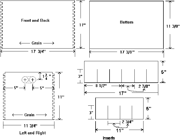 Cut all wood to the dimensions indicated above. Also follow the grain of the wood indicated above. If you do not follow the grain of the wood from above when you go to make the box joints the plywood will splinter. For the box joints I used a router table with a box joint jig. The router bit for the box joints is a twin edge 1/2" flute. Make sure when you cut the box joints that you cut both sides of the joint at the same time. This will ensure that both pieces will fit together properly. You will also need to make a 3/8" groove in the bottom of the case panels for the bottom to fit into. The groove should be about 3/16" deep and 1/2" from the bottom. The inserts are marked to the center of the cut. The cut on the inserts should be about 1/8" wide. When measuring the 17" insert make the measurements from the center of the board because, the outer insert box will not be 2 7/8", it will be 2 3/4". The holes for the handles where made with a 1 1/4" hole saw. When all the cuts have been made glue and clamp the box together with a good wood glue. I did not make any top for the box. That part is up to you.