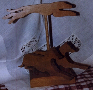 We have also done the crouching greyhound on a base using two 1/4" dowels on a 3" x 8" rectangular base. These are very nice on a desk. To construct that, follow the basic instructions above, but adjust the placement of the holes to allow for two dowels, one near the front legs and one near the back.