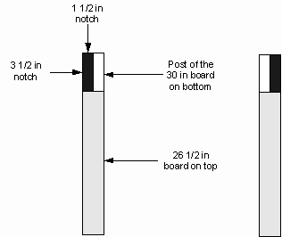 a) Align and nail the 26 ˝ in. boards on top of the notched 30 in. boards -2 with the posts on the right and 2 with the posts on the left as shown above (if the person nailing the board is young, think about drilling pilot holes using a twist drill)