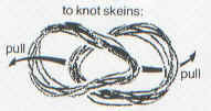 2. Untwist, but don’t unwind, the yarn skeins and knot them together as shown here: