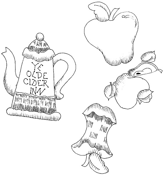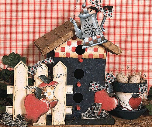 | Fence 1. Paint with White Cloud. Float shadows with Shadow Tan. 2. Spatter with Williamsburg Blue. Apply line-work with Black. Pitcher 1. Stain with Heavenly Grey. 2. Add checks with Tomato Red and Buttermilk. 3. Float shadows with thinned Black. Float highlights with White Cloud. 4. Apply line-work and lettering with Black. 5. Add decorative rag ribbon for a bow. Attach wire to the pitcher spout and handle. Later this will be attached to the birdhouse roof. Birdhouse 1. Apply Decorating Paste to the roof with a palette knife. Refer to jar for instructions. Allow to dry. 2. Paint the top front of the birdhouse Buttermilk. Allow to dry. 3. Add checks with Tomato Red, float shadows with thinned Burnt Umber. 4. Paint the rest of the birdhouse with Deep Midnight Blue. Paint the pegs Tomato Red. 5. Paint the base Hauser Dark Green. Paint the roof Raw Sienna. 6. Apply line-work with Black. Spatter entire birdhouse with Williamsburg Blue. Apples 1. Paint whole apples and the top and bottom of the cut apple with Tomato Red. 2. Paint the center of the cut apple with Buttermilk. 3. Paint all leaves Hauser Dark Green. Float around the edges of leaves with Jade Green. Paint the stems Burnt Umber. 4. Add checks to the center of the cut apple with thinned Burnt Umber. 5. Float shadows with Burnt Umber. Float around the edges of the apples with Dusty Rose. Add highlights with White. 6. Apply all line-work with Black. Spatter apples, leaves and stems with Williamsburg Blue. Terra Cotta Pot 1. Paint the rim and drip tray Deep Midnight Blue. 2. Paint the center Buttermilk. Allow to dry. 3. Transfer pattern. 4. Paint the apples following the instructions above. Paint the seed and highlight using Burnt Sienna. Finishing Instructions 1. Using a hammer and nail make a small hole in one of the whole apples and the cut apple. String wire through holes and attach to the fence. Curl the ends of the wire by wrapping around a pencil. Glue an apple and the fence to the front of the birdhouse as shown. 2. Attach the pitcher to the roof of the birdhouse using wire and hot glue. 3. Spray entire surface using Matte Sealer. 4. Add rag bows as shown. |